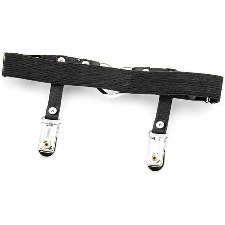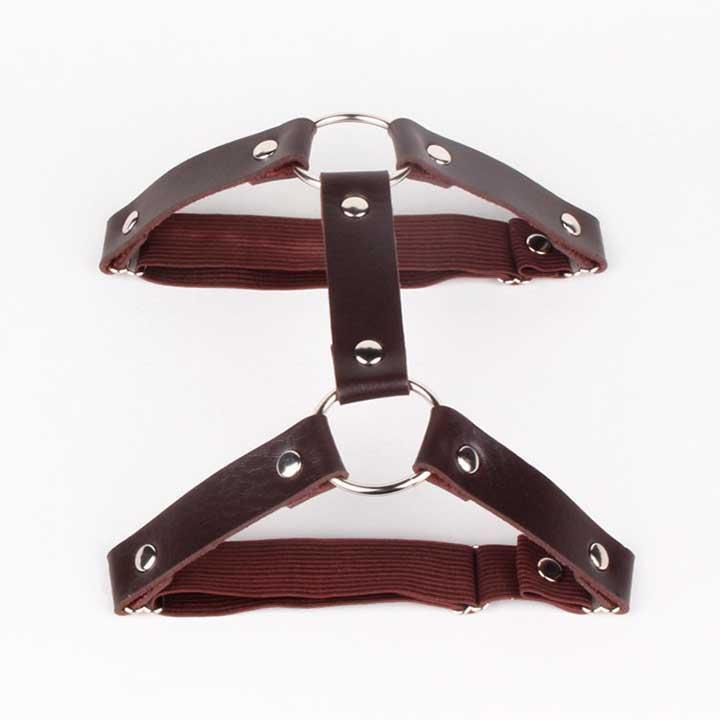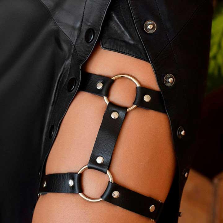 Гартери на ноги з металевими кільцями та регульованими застібками. Розмір: ширина ремінців 1,5 см, довжина ремінця на талії 105 см, довжина верхнього ремінця навколо ноги 48 см, нижнього 90 см. Матеріал: еко-шкіра, метал